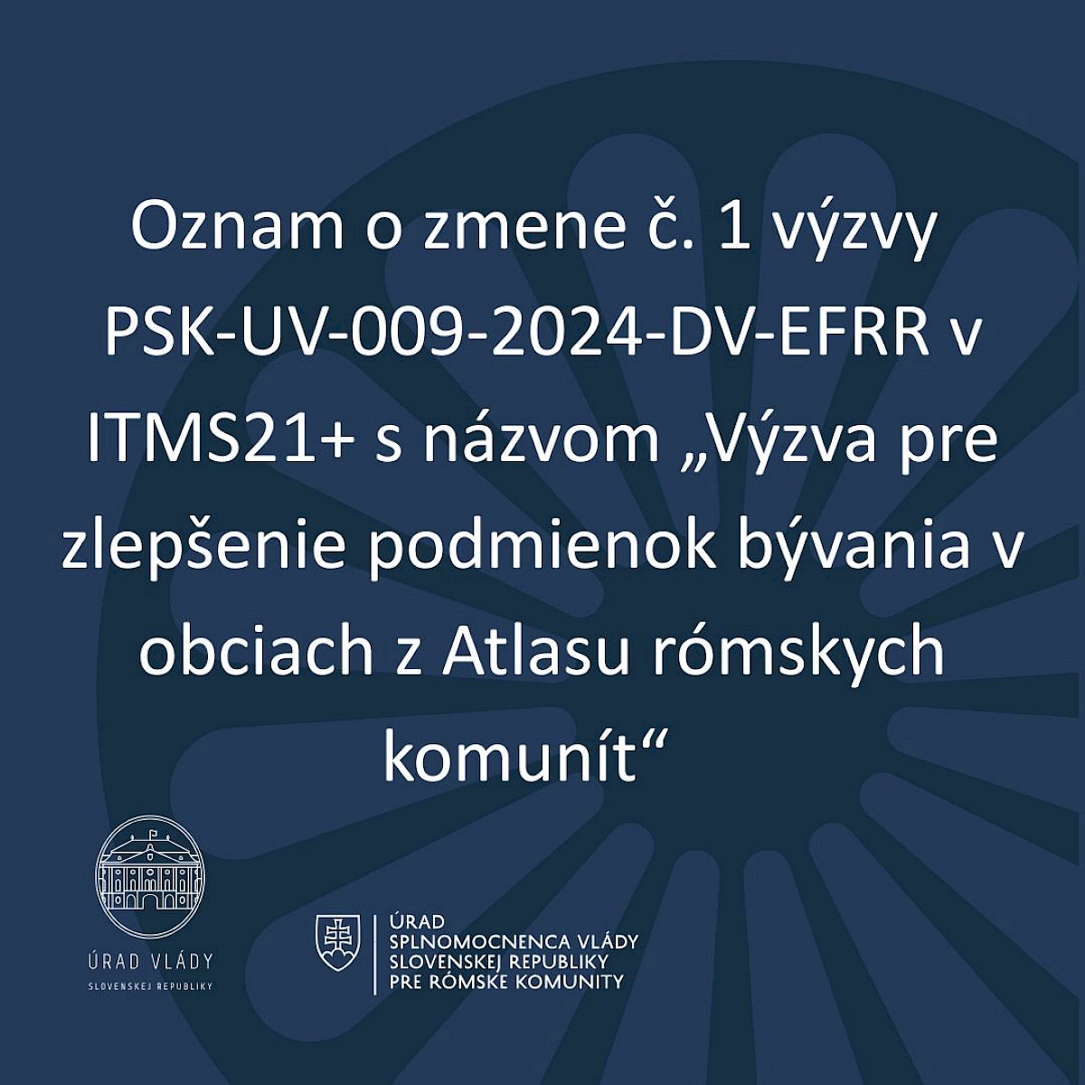Oznam o zmene č. 1 výzvy PSK-UV-009-2024-DV-EFRR v ITMS21+ s názvom „Výzva pre zlepšenie podmienok bývania v obciach z Atlasu rómskych komunít“